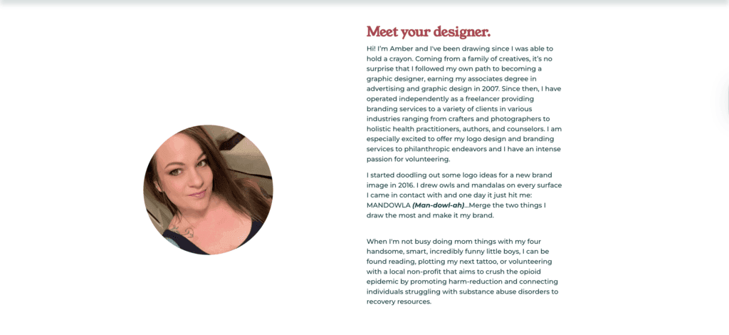 Amber is a graphic designer with a lifelong love of art, shaped by a family of creatives. Since earning her degree in advertising and graphic design in 2007, she’s worked with clients from crafters to counselors, with a special passion for philanthropic work. Her brand, Mandowla, blends her two favorite sketches—owls and mandalas—into one unique mark.